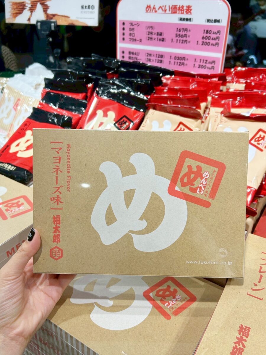 如果說去福岡只能選一種伴手禮帶回家,那我絕對是推爆山口油屋福太郎的明太子仙貝禮盒!他們家的「MENBEI」將福岡特產明太子跟日本傳統的點心仙貝完美融合,充滿濃郁海鮮香氣的仙貝吃起來酥脆又涮嘴,微辣的風味也非常適合搭配啤酒,可說是福岡最具人氣的特色伴手禮之一。